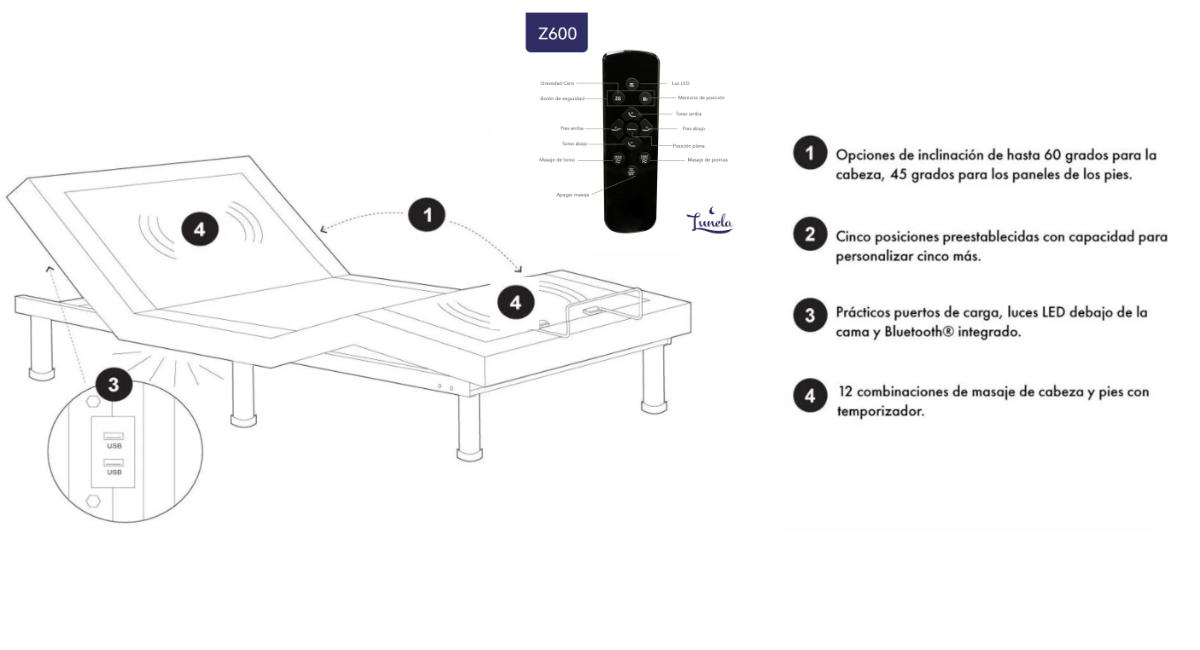 Posiciones preestablecidas: Ofrece diversas posiciones diseñadas para mejorar la comodidad, como anti-ronquidos, posición plana o gravedad cero.