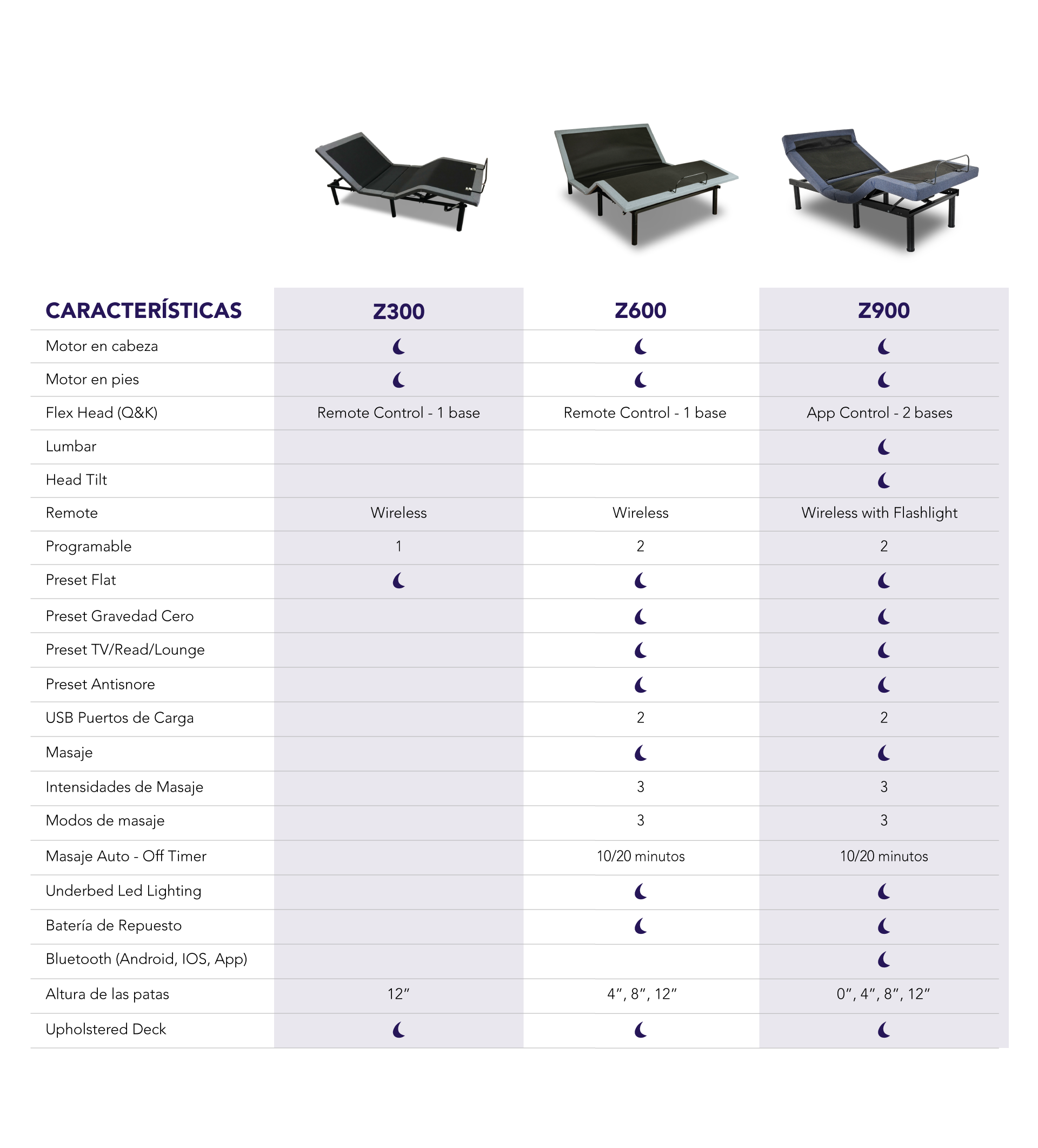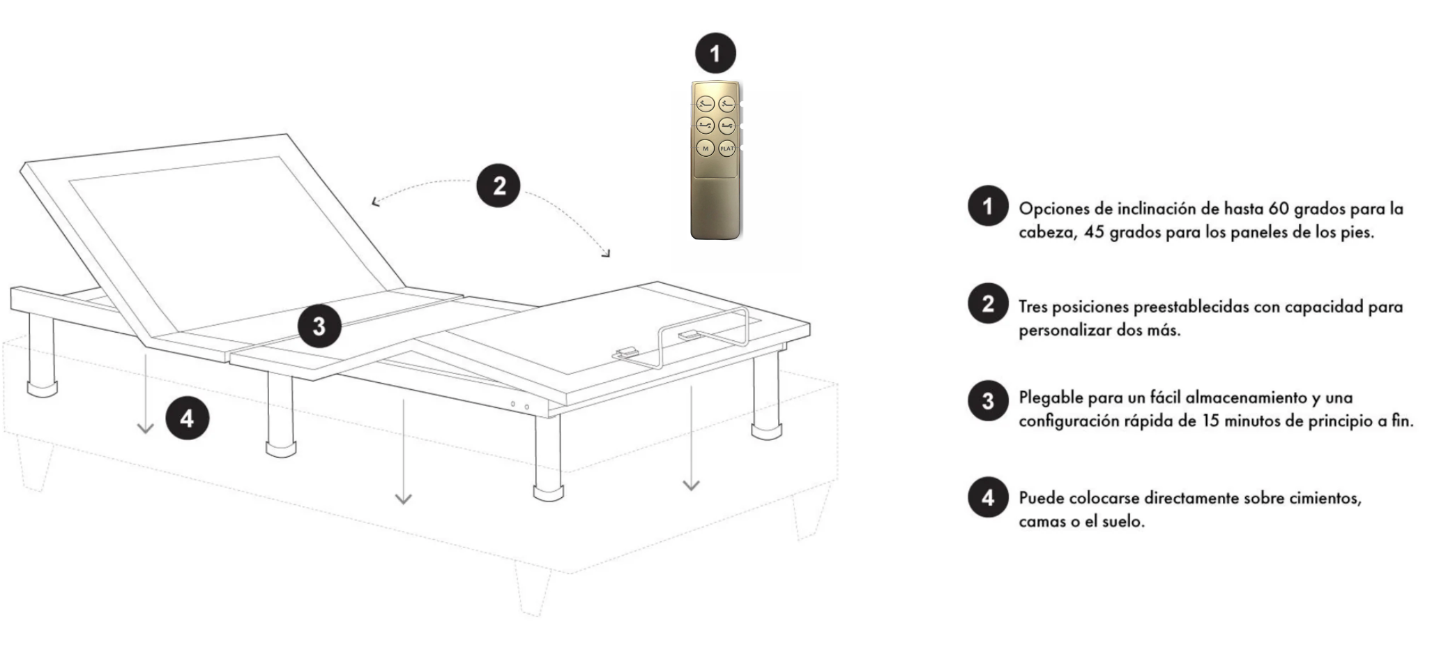 Structures E255 전동 조절식 침대는 현대적인 덮개 디자인이 특징이며 반으로 접을 수 있어 휴대가 간편합니다. 조정 가능한 헤드 및 풋 패널 외에도 이 베이스에는 세 가지 사전 설정 위치(무중력, 코골이 방지 및 플랫)가 있습니다.