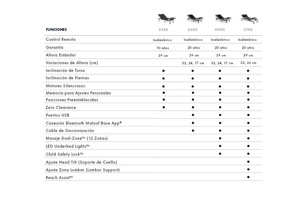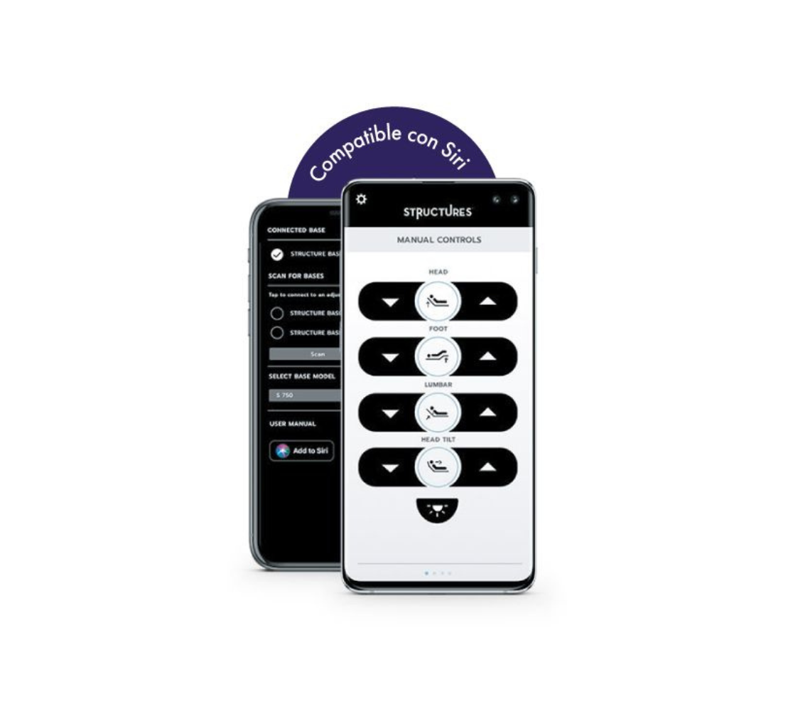 Cuenta con Bluetooth® que facilita la personalización de sus preferencias de sueño con la aplicación MALOUF® Base (Android e iOS), que incluye los comandos de voz Siri Shortcut integrados con iOS 12 y versiones posteriores.Su cama se puede operar con su teléfono o con el control remoto inalámbrico retroiluminado incluido.Estructura 100% Acero Tapizado 100% PoliésterAcolchado 100% Foam de Poliuretano (Padding: 100% Polyurethane foam)