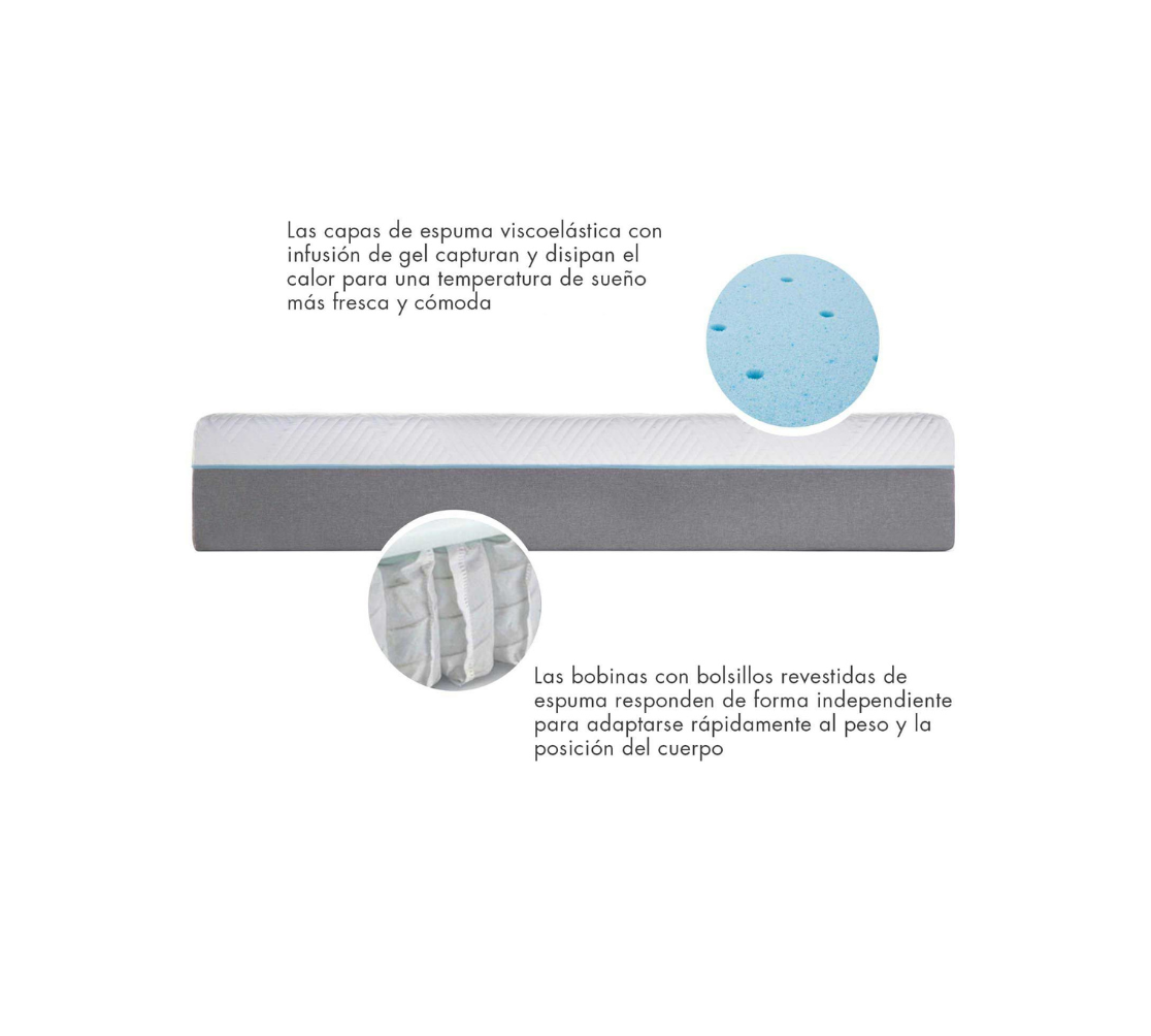 Memory Foam: Con infusión de gel está diseñada para apoyar, contornear y acunar las curvas naturales del cuerpo mientras alinea adecuadamente la columna vertebral.